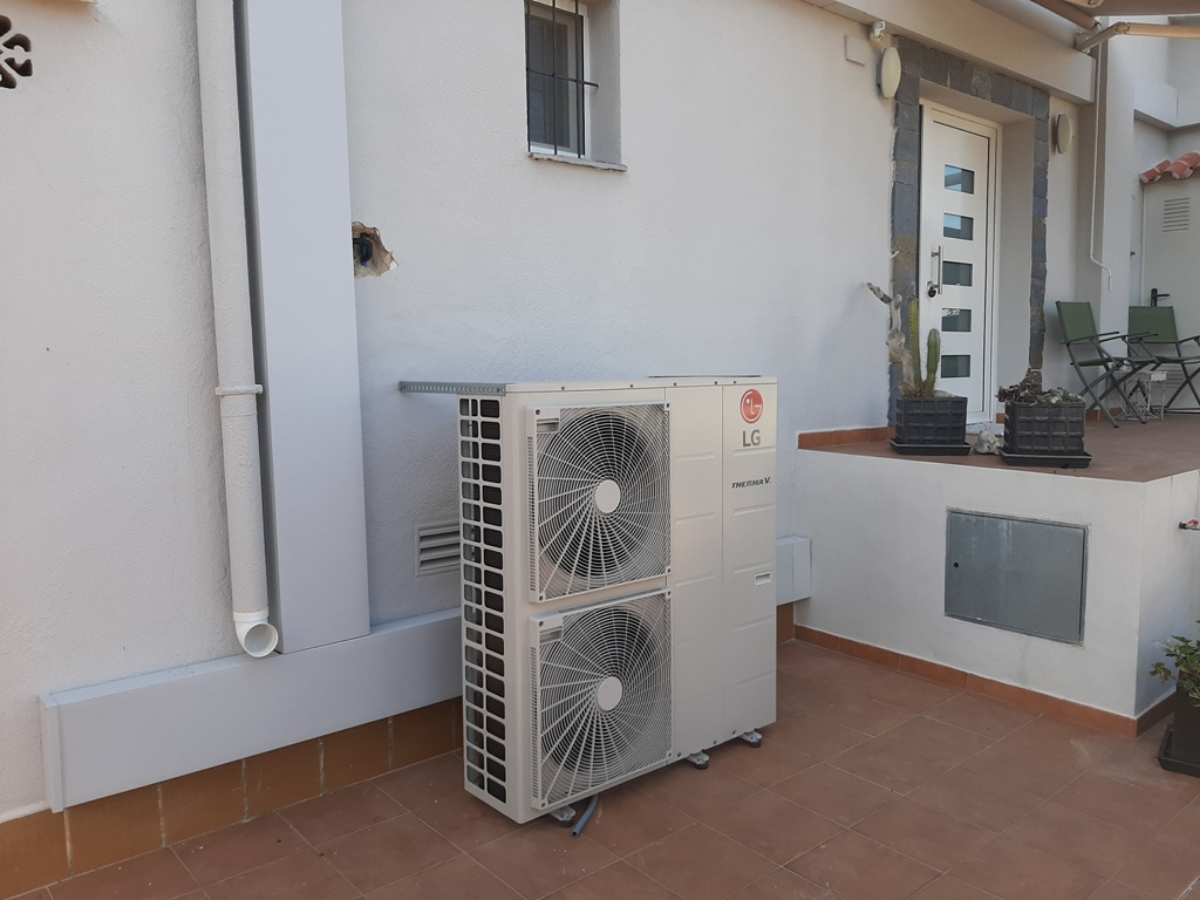 Es tracta d’un típic xalet de la zona. Els clients tenien gastos grans de gas propà i de llum elèctrica. Hem substituït la caldera de gas per una bomba de calor (aerotermia) . Les noves bombes de calor funcionen també amb radiadors, perquè són capaços de generar temperatures d’impulsió de 65 – 70 graus. Una bomba de calor aire/agua aprofita l’energia continguda en l’aire i la transforma en energia tèrmica per a calfar la casa (també piscines) . D’una banda d’electricitat que es gasta per al ventilador i el compressor, es reben 4 parts d’energia tèrmica gratis! Per açò les bombes de calor formen part de la família d’energies renovables. Addicionalment vam posar panells solars fotovoltaics, que ajuden a reduir el gasto de llum de la xarxa. Quan s’allarguen els dies, ja està la casa autosuficient. A la primavera i tardor s’aprofita l’energia sobrant per a calfar la piscina.